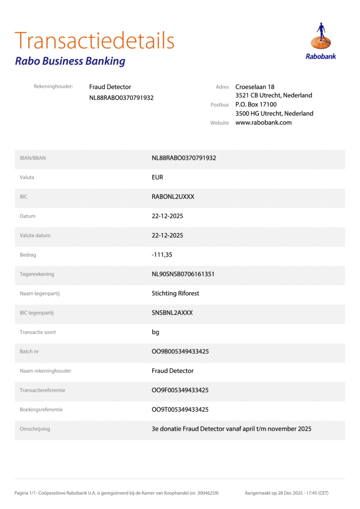 Fraud Detector eans a small commission if we refer someone to a webshop and a purchase is made. To do something for the climate, we donate a portion of all affiliate commissions to the Riforest foundation. The rest helps us maintain our website, and to improve our free tools.